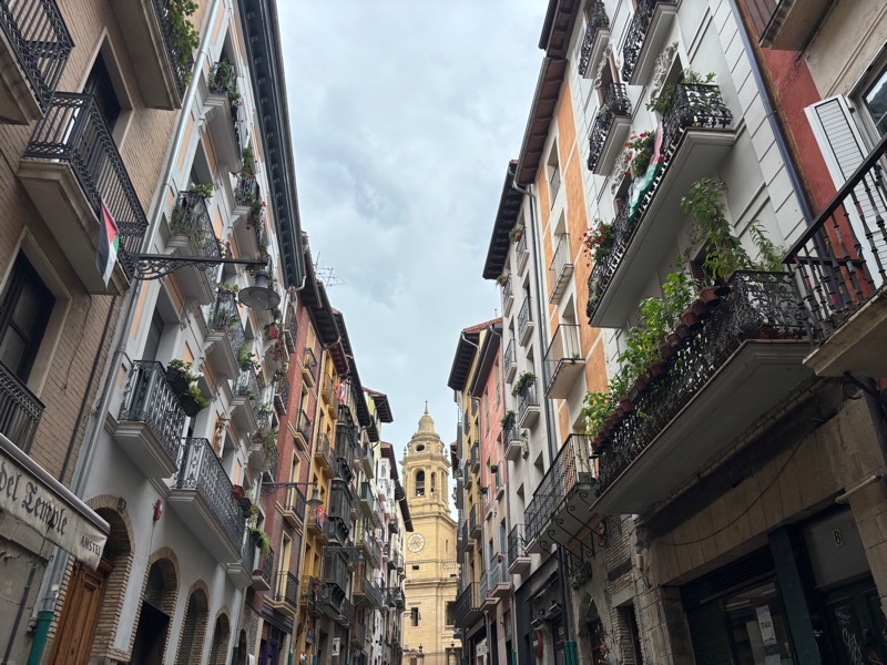 Megnéztük a hatalmas katedrálist. Pamplona egyébként az a város, ahol a híres bikafuttatás zajlik az utcákon. Vacsorára finom pintxos-t ettünk, ami olyan, mint a tapas, csak a baszkok így hívják. A mai hostel neve Aloha Hostel, ahol csak két másik lánnyal osztom a szobát – egy olasz lánnyal (ő nem zarándok) és egy ausztrál hölggyel (ő még nem kezdte el az utat). Ez egy luxus szoba a korábbiakhoz képest. Még törölközőt is kaptam! Nem is számítottam rá, így nem vettem észre, és a sajátomat használtam zuhanyzáskor. Nagyon várom az éjszakát, remélem jól alszom. Kevésbé várom a holnapi 38 fokos túrát, ami csak 11-kor kezdődik…